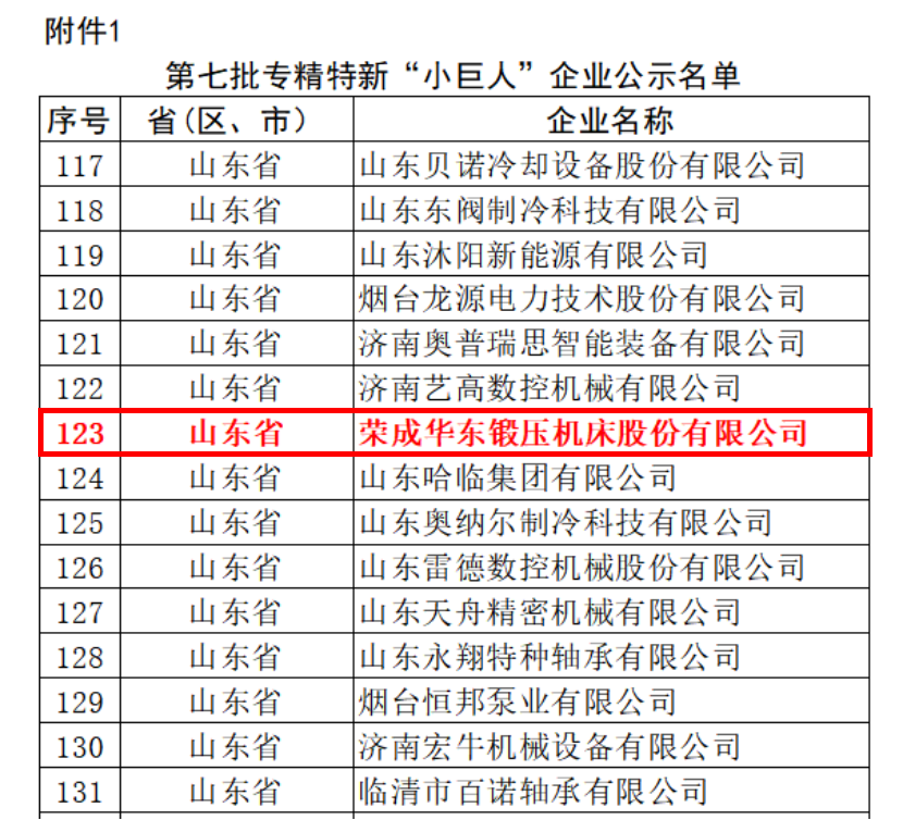 近日,山東省工業(yè)和信息化廳公布《關(guān)于山東省第七批專(zhuān)精特新”小巨人”企業(yè)名單公示》,榮成華東鍛壓機(jī)床股份有限公司憑借其在金屬成形機(jī)床高端裝備領(lǐng)域突出的創(chuàng)新能力、技術(shù)實(shí)力和市場(chǎng)地位,成功入選。這一國(guó)家級(jí)榮譽(yù)的獲得,標(biāo)志著榮成華東鍛壓機(jī)床股份有限公司在專(zhuān)業(yè)化、精細(xì)化、特色化、新穎化的發(fā)展道路上取得里程碑式的成就。